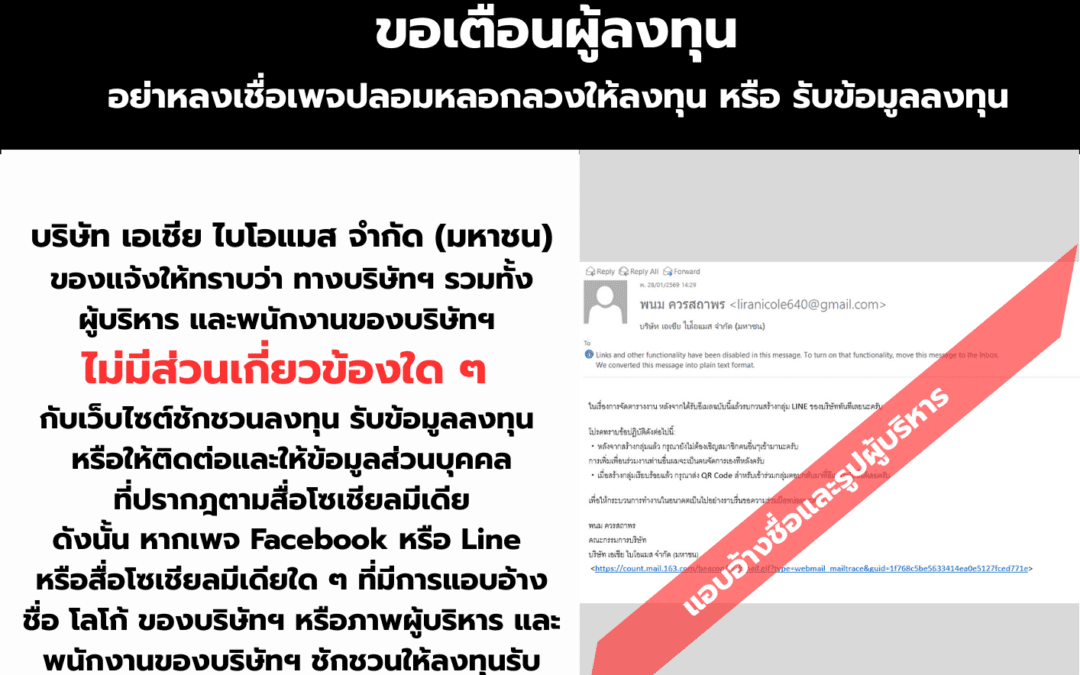 บริษัท เอเชีย ไบโอแมส จำกัด (มหาชน) ขอเตือนผู้ลงทุนและประชาชน อย่าหลงเชื่อเพจปลอมหลอกลวงให้ลงทุน หรือ รับข้อมูลลงทุน